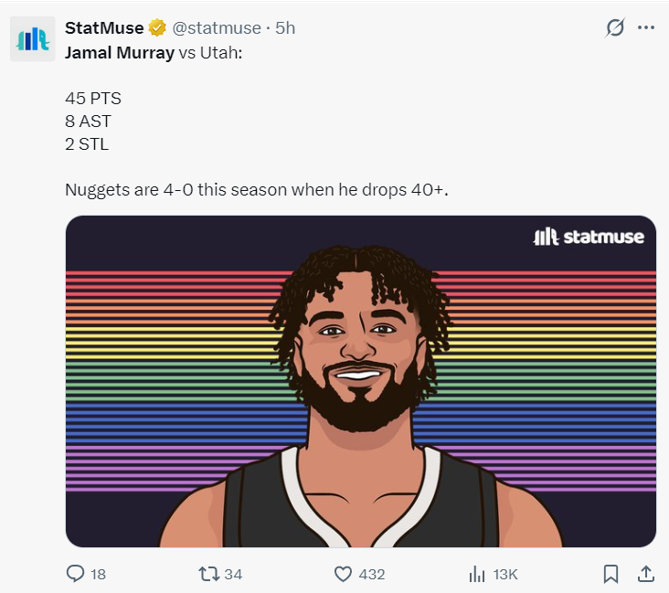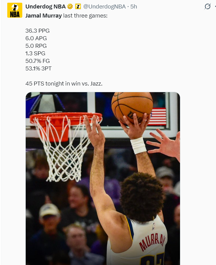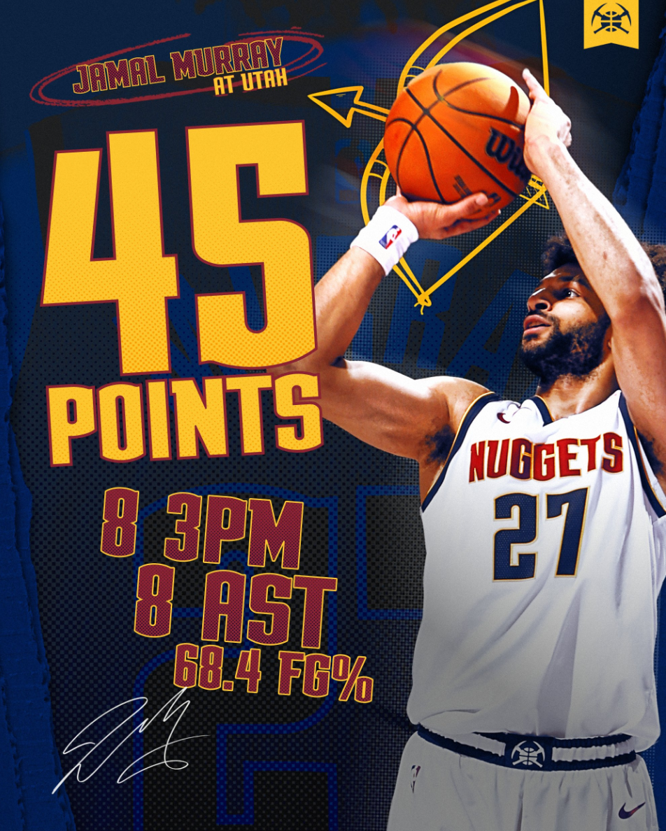 他在第三节三分7中5拿到18分1抢断,末节2中2+罚球6中6拿到10分,整个下半场拿到28分。而约基奇全场比赛只拿到22分12篮板5助攻,此役掘金就是靠穆雷才拿下的。