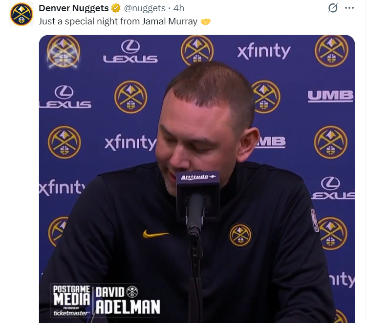 赛后阿德尔曼谈到穆雷:他扛着球队前行,他看上去是球队最具活力的球员,在约基奇遭遇重兵看护的情况下他挺身而出,这是属于穆雷的夜晚,我很喜欢这样的时刻,因为我们都希望他打出这样的表现,我们也知道他可以接管比赛,三分球、罚球线、投篮效率都可以很惊人。